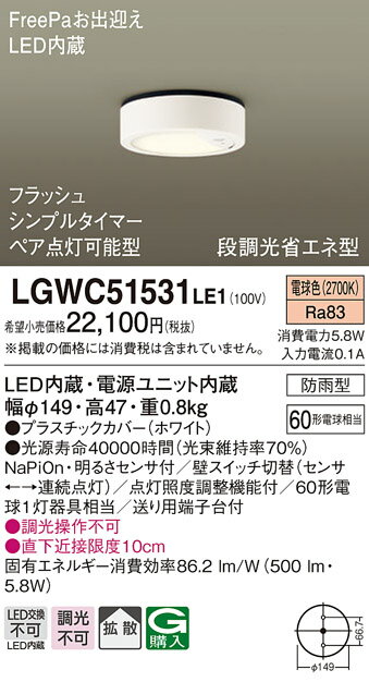 【最安値挑戦中!最大25倍】【納期未定】パナソニック LGWC51531LE1 ダウンシーリング 天井直付型 LED(電球色) 拡散タイプ 防雨型・FreePaお出迎え・フラッシュ・ペア点灯型