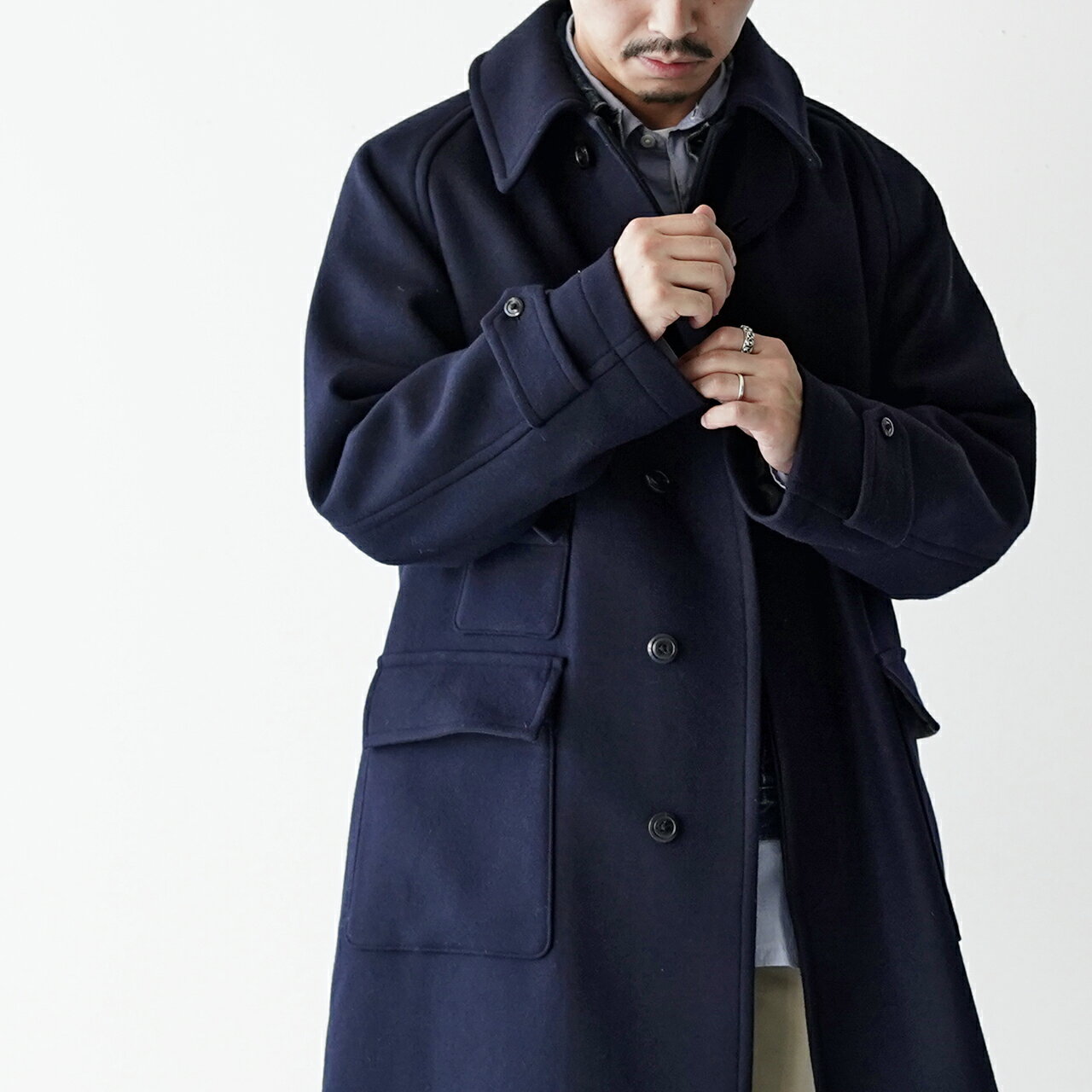 関連キーワード メンズ アウター コート メルトン ヘビーメルトン 毛 無地 紺 日本製 ダブルクロス Aラインシルエット ワイド オーバーサイズ ラグランスリーブ トラベラーコート ミドル丈 ビジネス 通勤 シンプル カジュアル トラッドブランドを代表するマスターピース KAPTAIN SUNSHINE / キャプテンサンシャインのウィンター・ベーシックアイテムとして、高い完成度を誇る「Traveller Coat」。