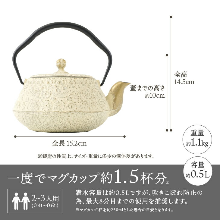 商品説明 名称 南部鉄器 急須 雪桜 0.5L 金白 伝統工芸品 素材 材質:本体、フタ:鋳鉄 持ち手:鋼材茶こし:ステンレス カラー 金白 サイズ 満水容量:約0.5L 使用人数目安:2~3人用(0.4~0.6L) 注ぎ口を含む全長: 約15.2cm 持ち手を含む全高: 約14.5cm 蓋までの高さ: 約10cm 底面直径:約7cm 重量:約1.1kg IH IH非対応※直火不可 持ち手 持ち手は倒せます。