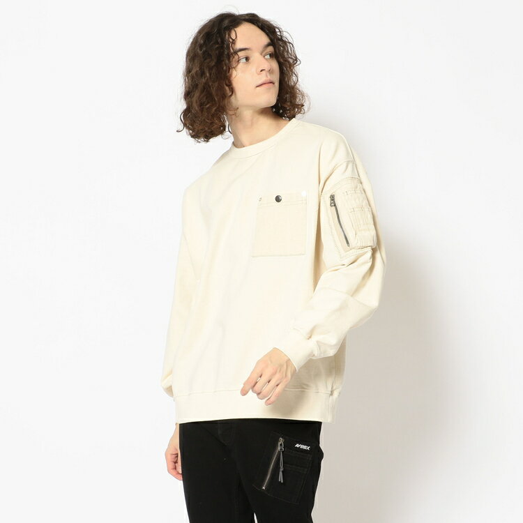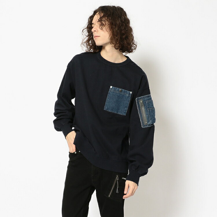 ・メーカー希望小売価格はメーカー商品タグに基づいて掲載しています エビデンス(証明資料)COLOR:005 NATURAL model: H175 B83 W66 H87 着用サイズ: L COLOR:087 NAVY model: H175 B83 W66 H87 着用サイズ: L COMMENT デニム生地のリメイク調ポケットを貼ったクルーネックスエットドライ感のある米綿スウェットをボディに使用、フロントのマチ付きポケットと、左袖に大きくデフォルメされたMA-1のシガーポケットが程よいアクセントとなっています。