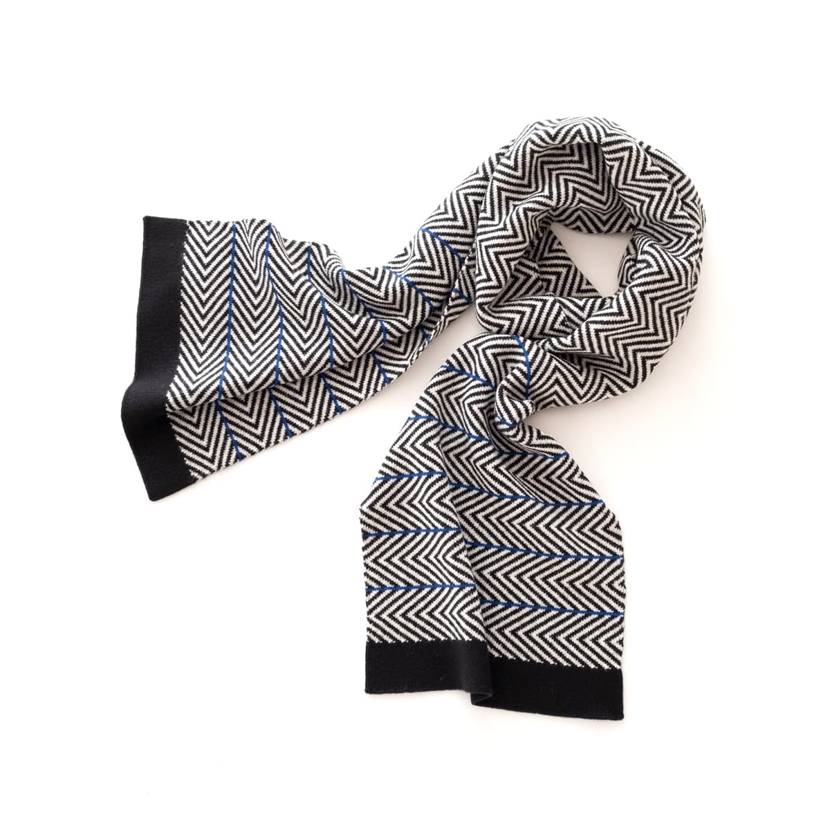 ZIG ZAG‘RILEY’SCARF 紡糸の工程においてヨーロッパ地域では珍しい軟水を用いた、とても肌触りが良く滑らかなメリノウール100%の生地を使用しております。
