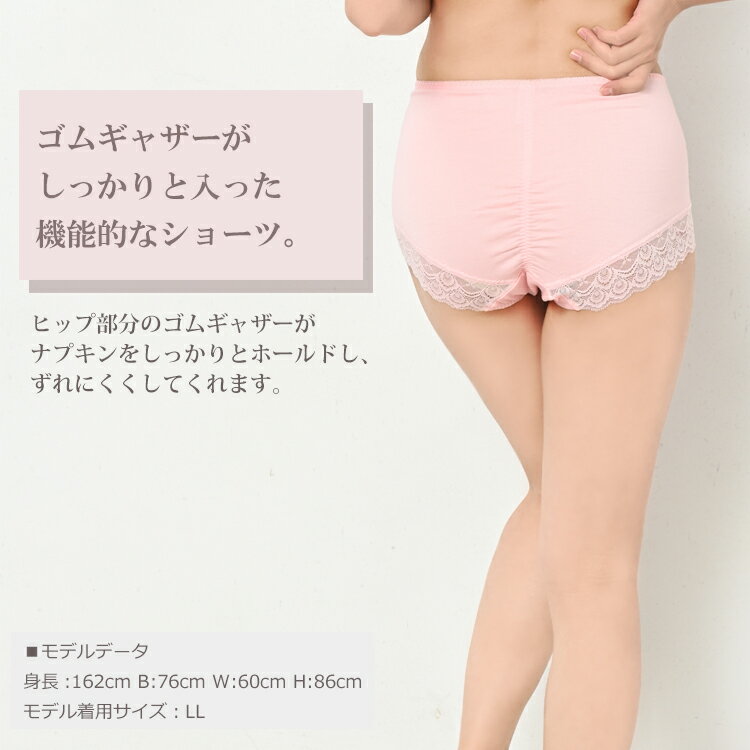 冷え防止や漏れ防止などになる股上深めの設計が◎ヒップ部分のゴムギャザーがナプキンをしっかりとホールドしずれにくくしてくれます。