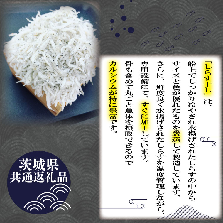 商品説明 【茨城県共通返礼品/北茨城市】 「しらす干し」は、船上でしっかり冷やされ水揚げされたしらすの中からサイズと色が優れたものを厳選して製造しています。