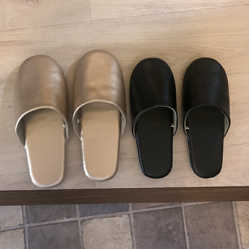 大人風 おしゃれな足元Faux leather slippersフェイクレザースリッパ フェイクレザーの おしゃれなニュアンス シンプルで落ち着いた雰囲気のフェイクレザースリッパ。